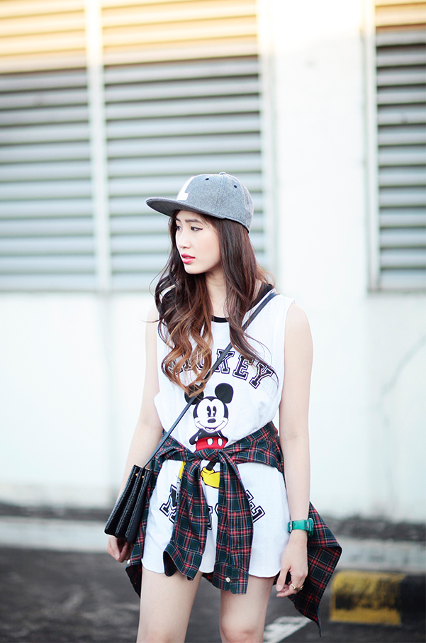 Getting comfy wearing oversized Mickey Mouse printed t-shirt. I'm such a huge Disney fan and this shirt is too cute to resist! Having a shirt wrapped around my waist is probably one of my favourite style to go with oversize tees or t-shirt dresses. By wearing a cap, it adds the boyish look to my outfit and wearing a Céline sling bag to keep the look simple and not going overboard. Finally, a pair of red Louboutin's loafer to add some bright color to the outfit and finish the look